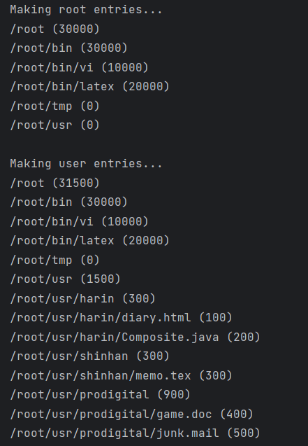 - 파일과 디렉토리로 구성된 데이터 구조 안을 visitor가 돌아다니며 파일 목록을 표시한 결과입니다.