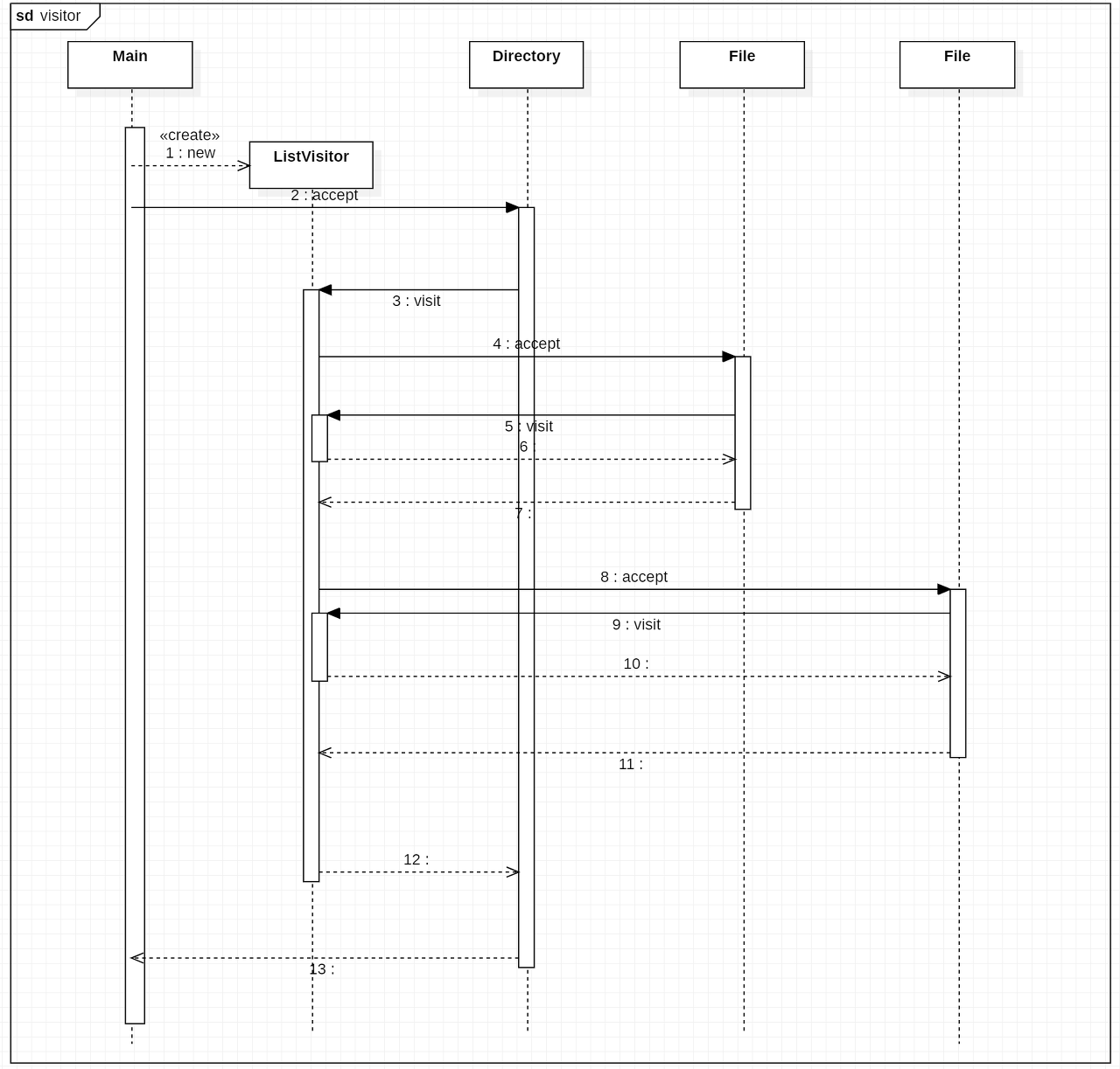 - File의 인스턴스는 인수로 전달된 ListVisitor의 visit(File) 메소드를 호출합니다. (ListVisitor는 여전히 visit(Directory)를 실행 중입니다.)